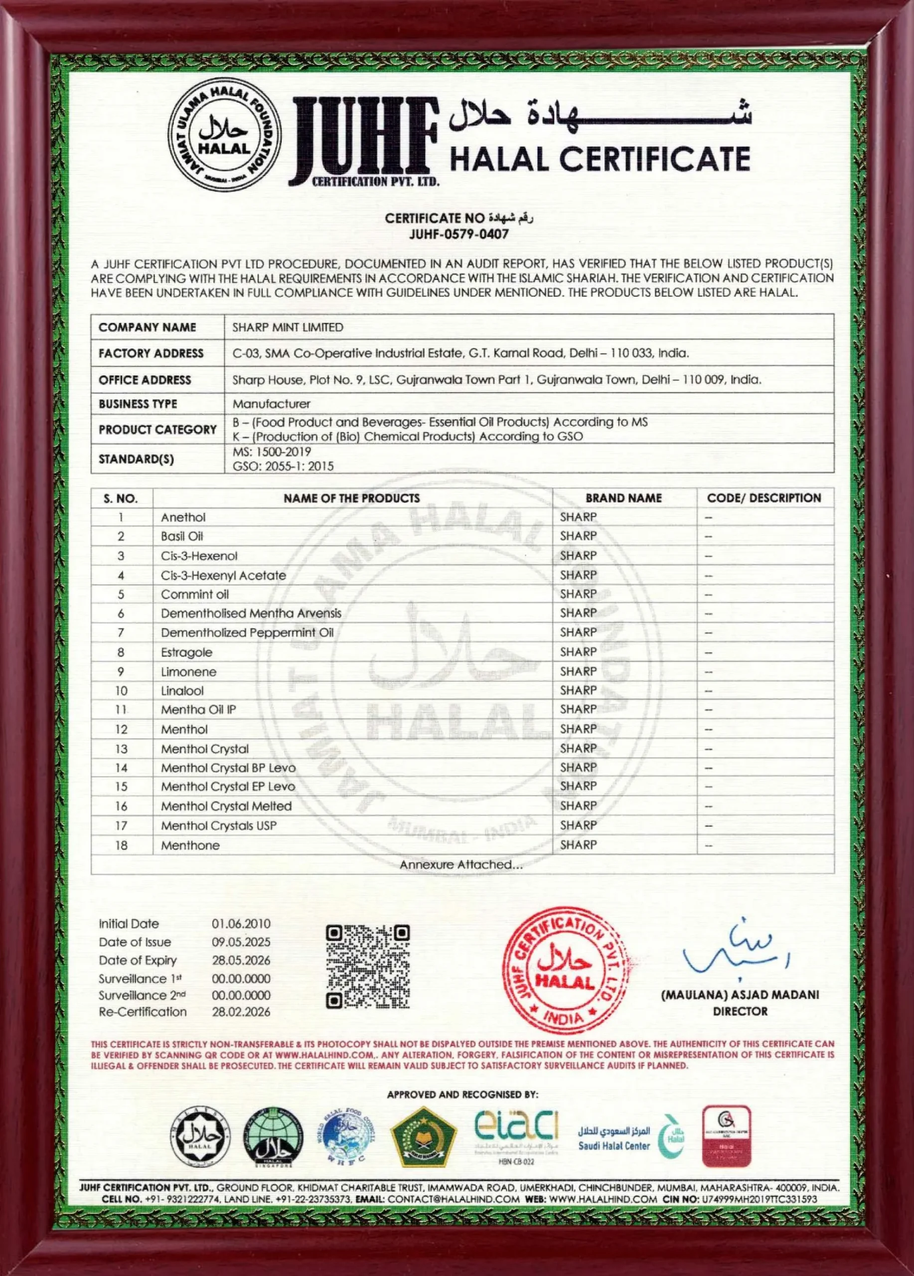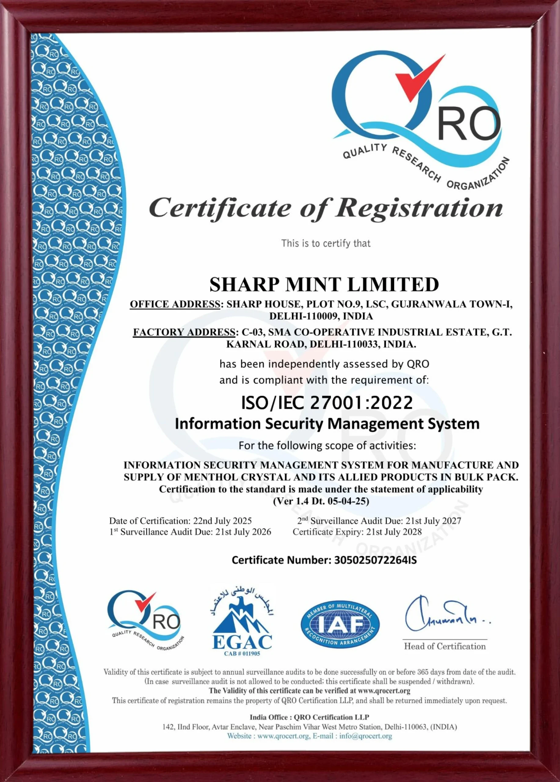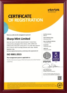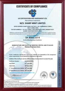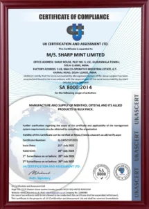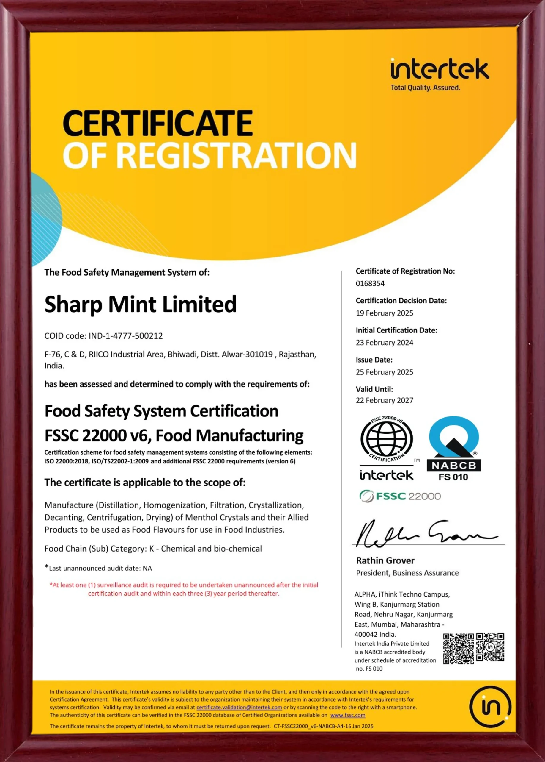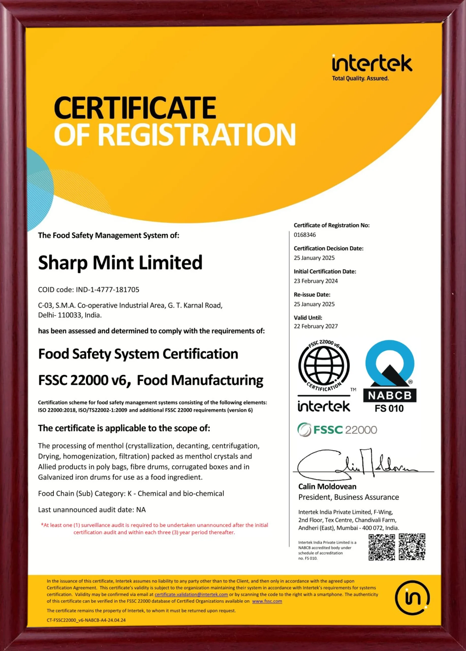 At Sharp Mint, quality, quantity, and consistency define our approach. We uphold the highest global standards in hygiene, safety, and manufacturing, ensuring our mint-based products meet strict regulatory and customer requirements for pharmaceutical and food applications. Our advanced technical and laboratory infrastructure guarantees precision, while stringent food defense and security measures protect against contamination, tampering, and threats.